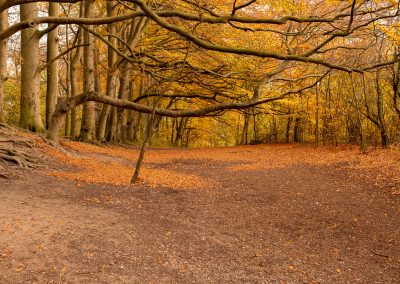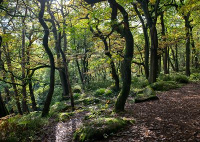 Burbage Brook carving a path through the woodland, Padley Gorge, Peak District